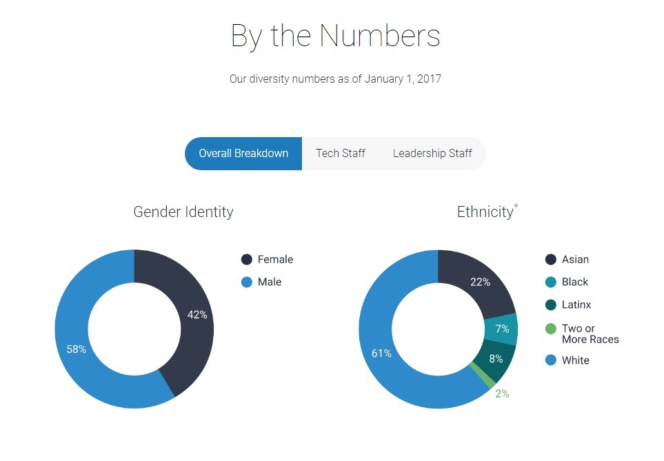 - Annually publish data and progress metrics on the diversity of our technology workforce across functional areas and seniority levels;